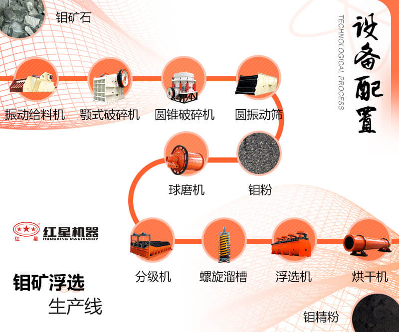 开采而来的天然钼矿首先要经过鄂式破碎机的粗碎,进行初步的破碎,随后将符合粒度要求的钼矿物料经圆锥破碎机进行再次的细碎,合格的物料经提升机送至料仓等待研磨。由给料装置将物料送入球磨机进行研磨,随后将研磨后的钼矿细料送入螺旋分级机进行洗净和分级,随后经由搅拌桶送至浮选机进行浮选作业,浮选作业主要将所需矿物与其他矿物分离开,最后通过高产浓缩机将矿物中的水分去除,就得到了生产所需的钼矿原料。